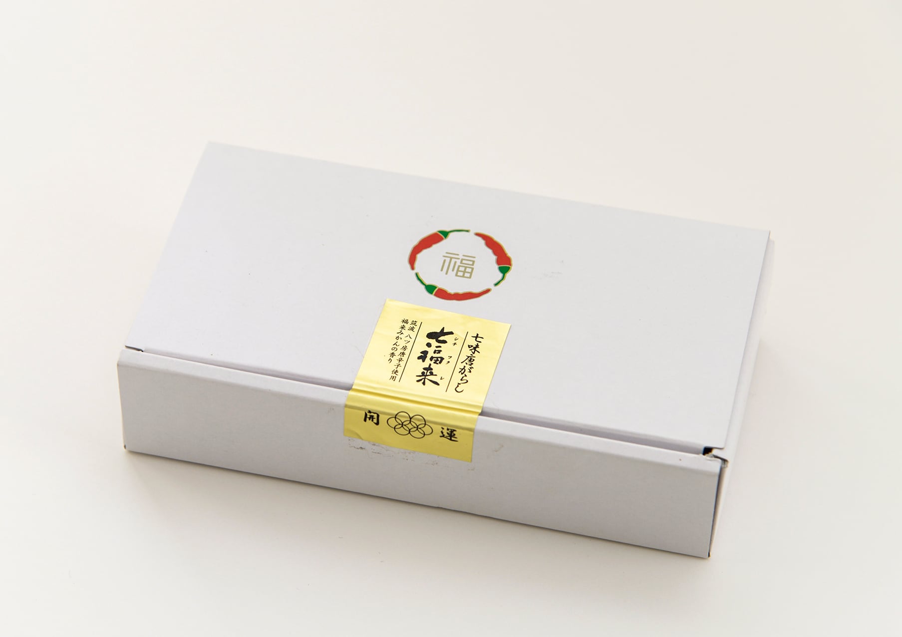 七福来七味唐辛子、七福来塩七味の袋と、筑波八ツ房唐辛子が3本入った瓶のギフトbox。
